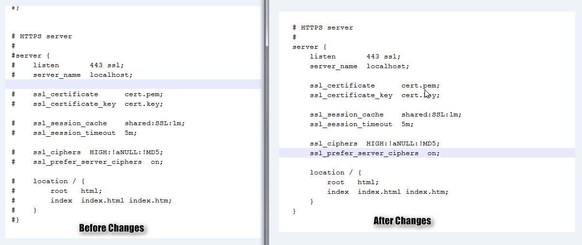 - Uncomment the server { listen 443 ssl;} region below the line # HTTPS Server.